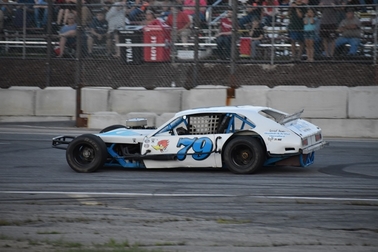 The Modifieds where staged and ready for their feature. The pack was tight and these mod drivers drove inches apart. When the last flag came down it was on Arthur Hannaford from Me in his #71 Malibu. Charlie Lima from Ma in his #2X Coupe took a second by inches and pulling off a third was Scott Tucker from Me in his #79 Pinto. All three were brought trackside for an out of car interview and awarded with trophies.